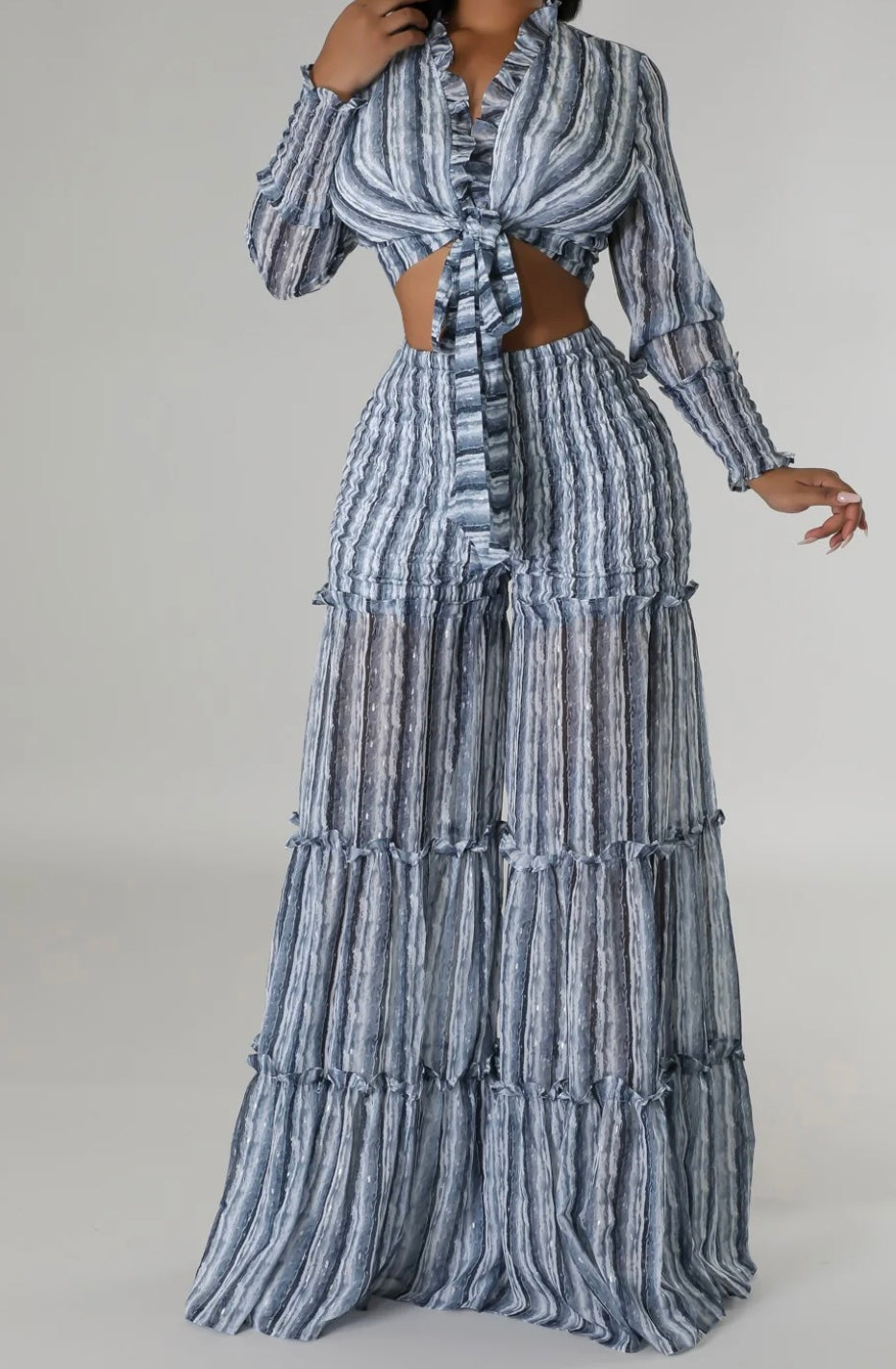 Sheer with linen 2 piece pants set. Bottoms stretch good. Top has no stretch. Model wearing size small.