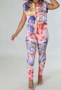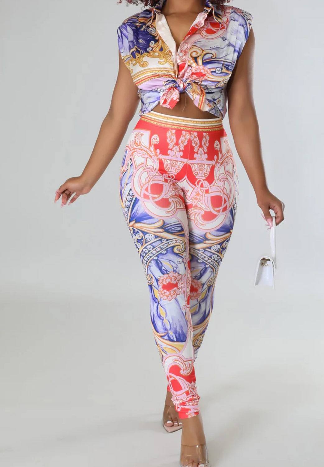 2 piece short sleeve button down top with stretch pants. Semi stretch on the pants. No stretch at all with the top.