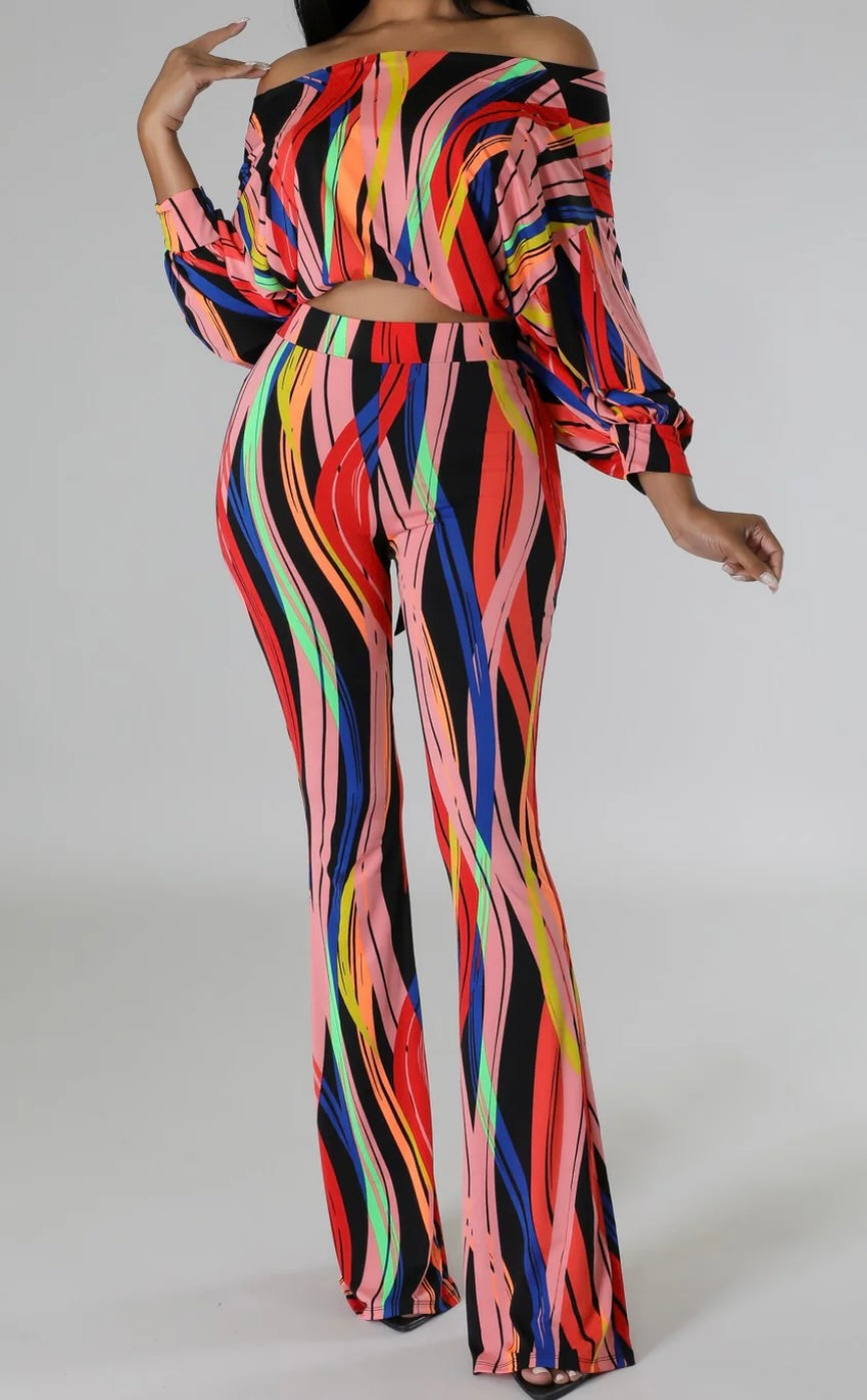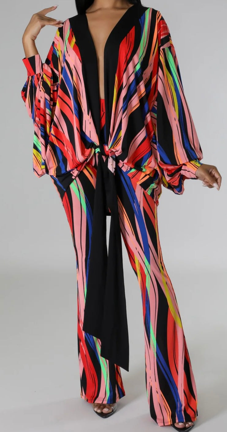 2 piece colorful versatile cardigan with wide leg pants. Both pieces has amazing stretch. Model wearing size small.