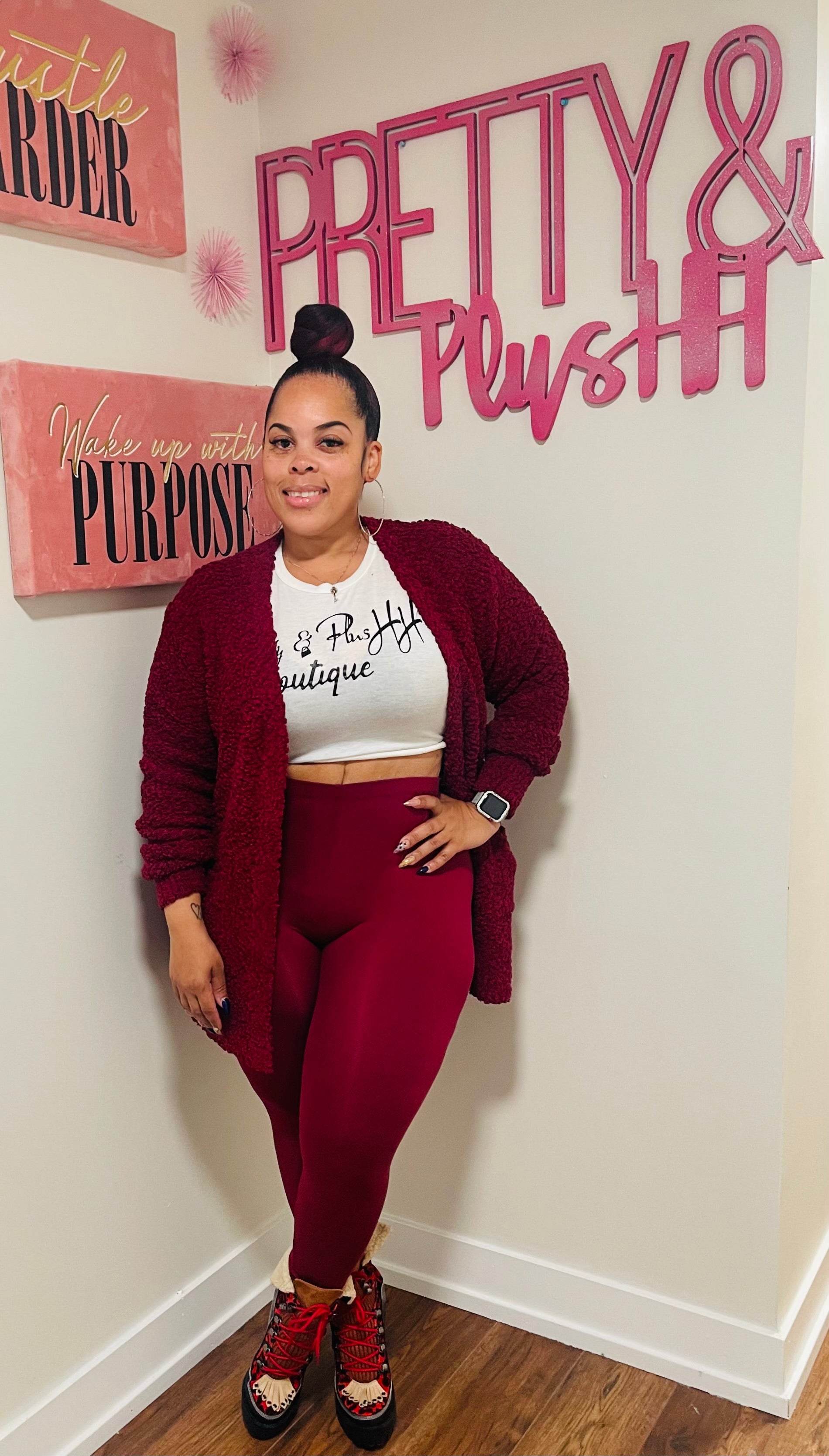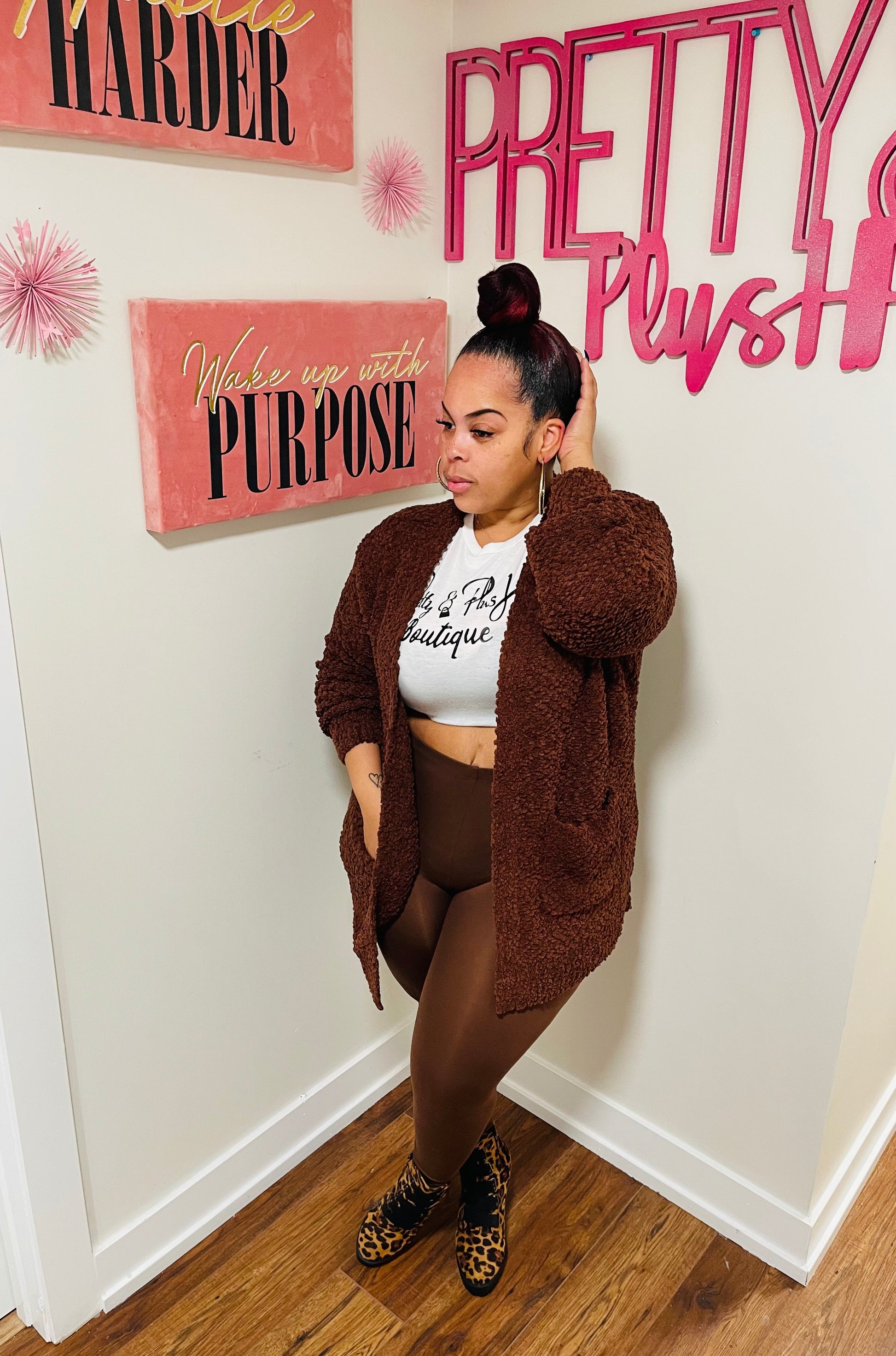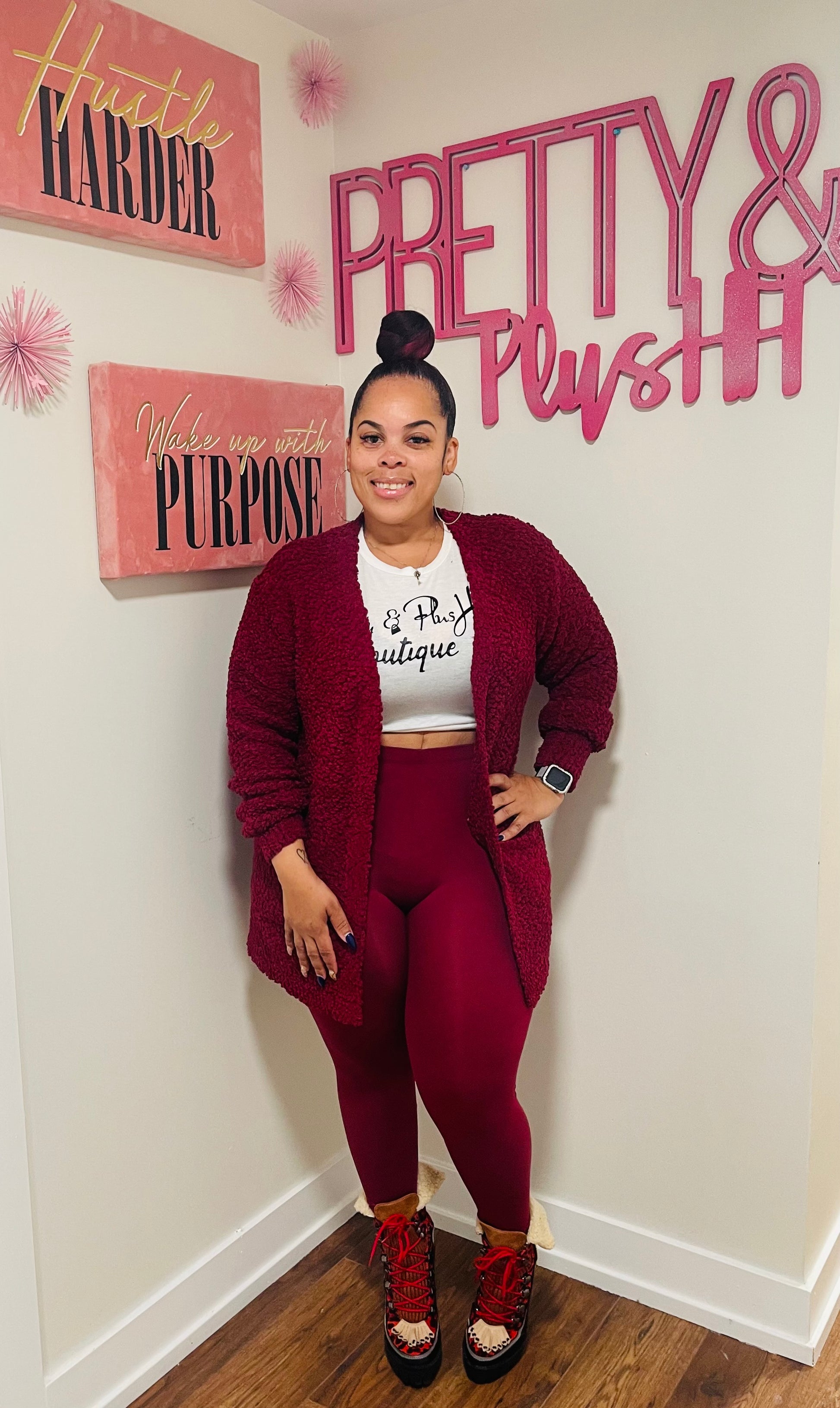 Stretchy popcorn sweater with pockets with stretchy stretch pants. Model wearing size medium. Pants has hyper stretch.